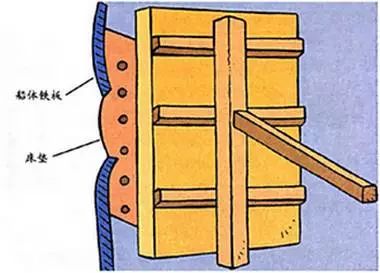 情况3:如果破洞水压太大,应在船体外破洞处敷设堵漏毯减少进水量,再在船内用木板、支柱等方式堵漏。